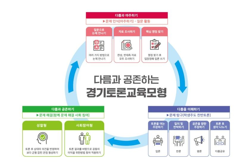 경기도교육청이 올해부터 학생들의 깊이 있는 사고력과 열린 시민성 함양을 목표로 '경기토론교육'을 도입했습니다. 이 교육은 '다름과 공존하는 경기토론교육 모형'으로 구체화되었는데요, 독일의 '보이텔스바흐 협약'을 반영했다고 밝히고 있습니다.